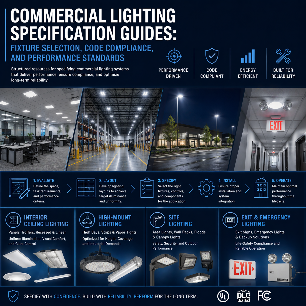 Specification-grade fixtures and documentation support—aligned to lumen output, glare control, controls compatibility, voltage range, and environmental ratings.